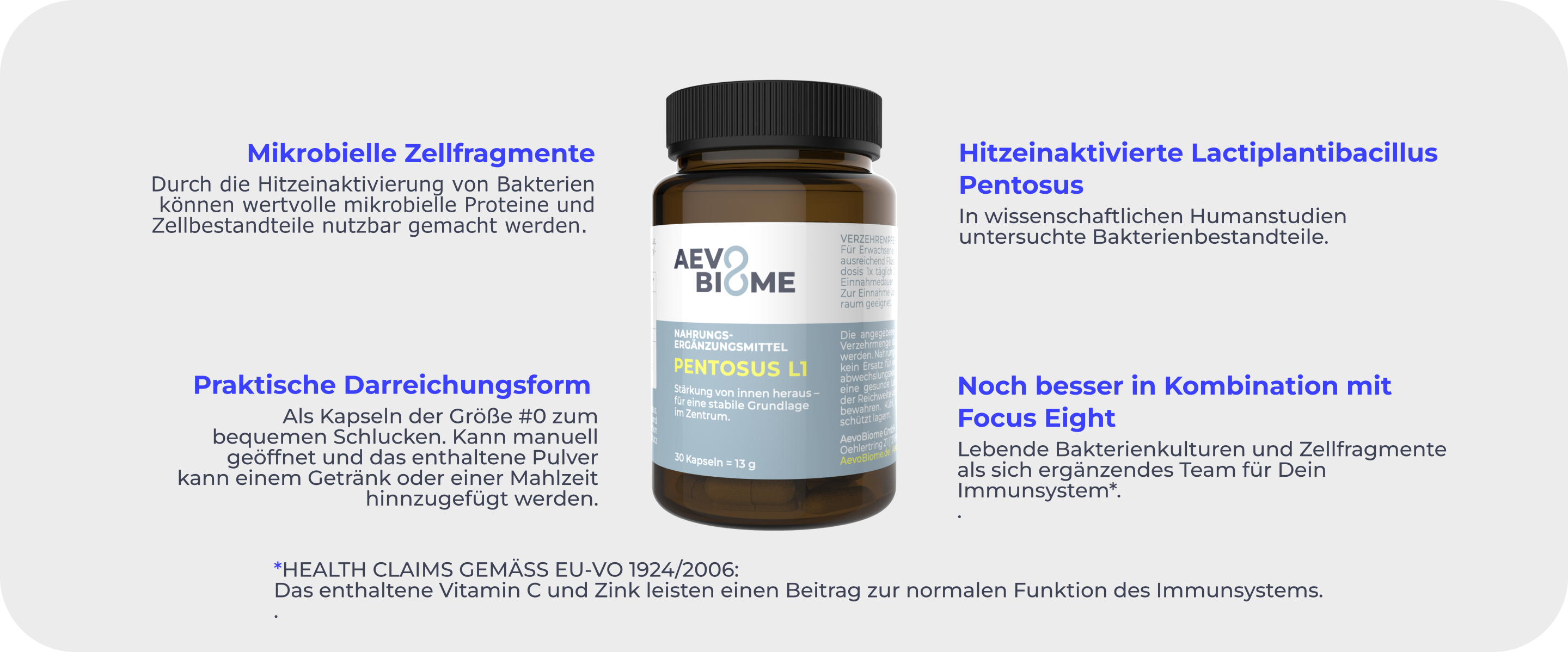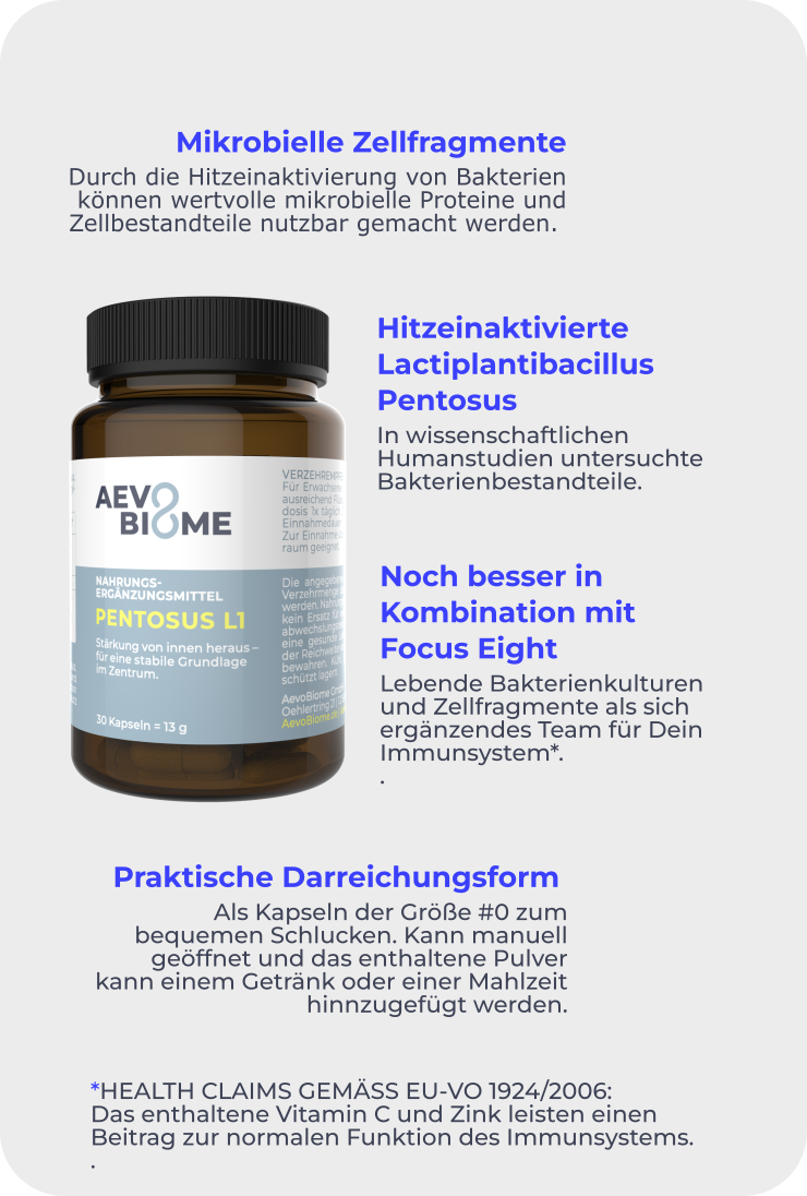 In unserem Shop dürfen wir nur solche Aussagen machen, die nach der EU-Health-Claims-Verordnung offiziell zugelassen sind. Für viele Inhaltsstoffe –auch die in Pentosus L1 enthaltenen hitzeinaktivierten Lactiplantibacillus – sind keine allgemein gültigen gesundheitsbezogenen Angaben freigegeben. Deshalb formulieren wir hier bewusst zurückhaltend.