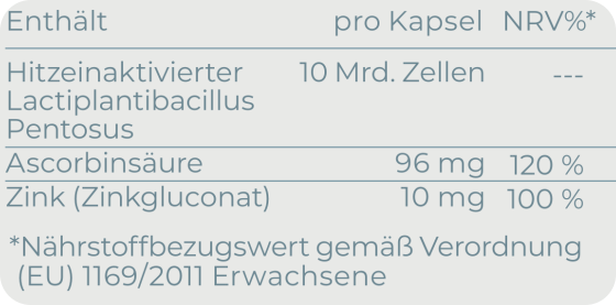 Hitzeinaktivierter Lactiplantibacillus Pentosus, Maltodextrin, Ascorbinsäure, Überzugsmittel: Hydroxypropylmethylzellulose, Pektin, Zinkgluconat