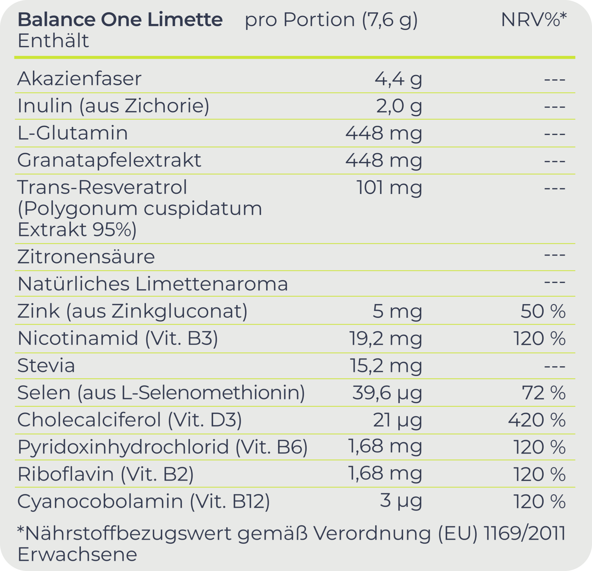 Limette: Akazienfaser, Inulin, L-Glutamin, Granatapfelextrakt, Zitronensäure, Polygonum Cuspidatum Extrakt (Resveratrol 95%), Natürliches Limettenaroma, Zinkgluconat, Nicotinamid, Stevia, L-Selenomethionin, Cholecalciferol, Pyridoxinhydrochlorid, Riboflavin, Cyanocobolamin
