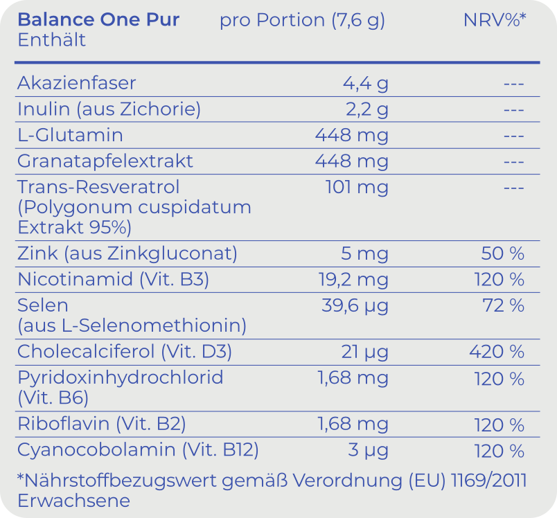 Pur: Akazienfaser, Inulin, L-Glutamin, Granatapfelextrakt, Polygonum Cuspidatum Extrakt (Resveratrol 95%), Zinkgluconat, Nicotinamid, L-Selenomethionin, Cholecalciferol, Pyridoxinhydrochlorid, Riboflavin, Cyanocobolamin