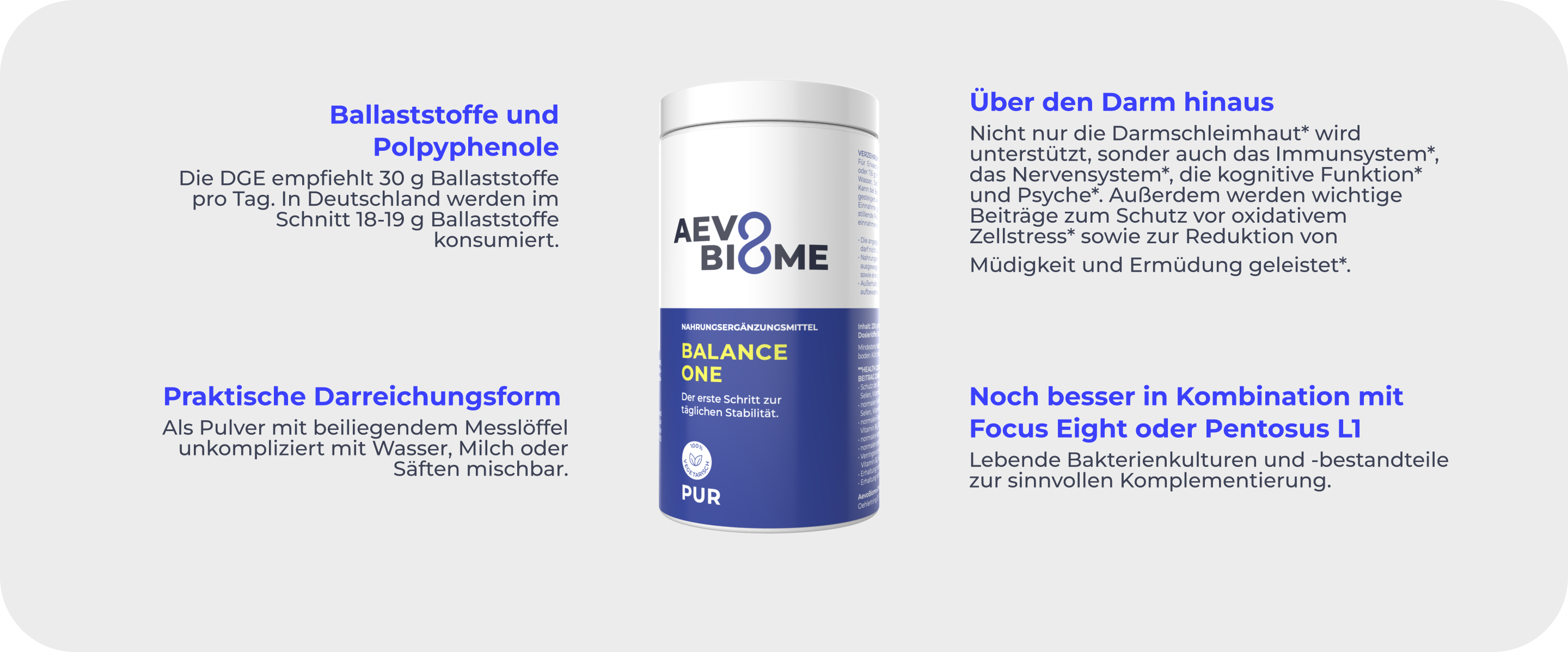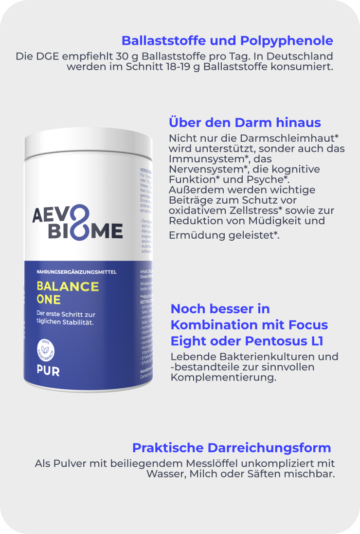 Kurz erklärt: Ballaststoffe und Polyphenole sind natürliche Bestandteile der Ernährung. Verschiedene Typen werden im Darm von unterschiedlichen Bakterien genutzt. Für BALANCE ONE setzen wir bewusst auf zwei ausgewählte Ballaststoffarten und zwei definierte Polyphenolquellen – für Vielfalt, ohne die Dosierung zu verwässern.